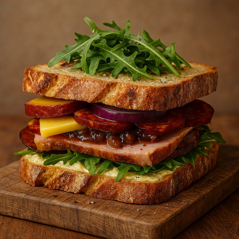 Introduce the ham. It should have a little bark, as if turned on a spit beside a medieval hearth. Sturdy enough that it won’t fold. Absolutely no plastic-packed squares.