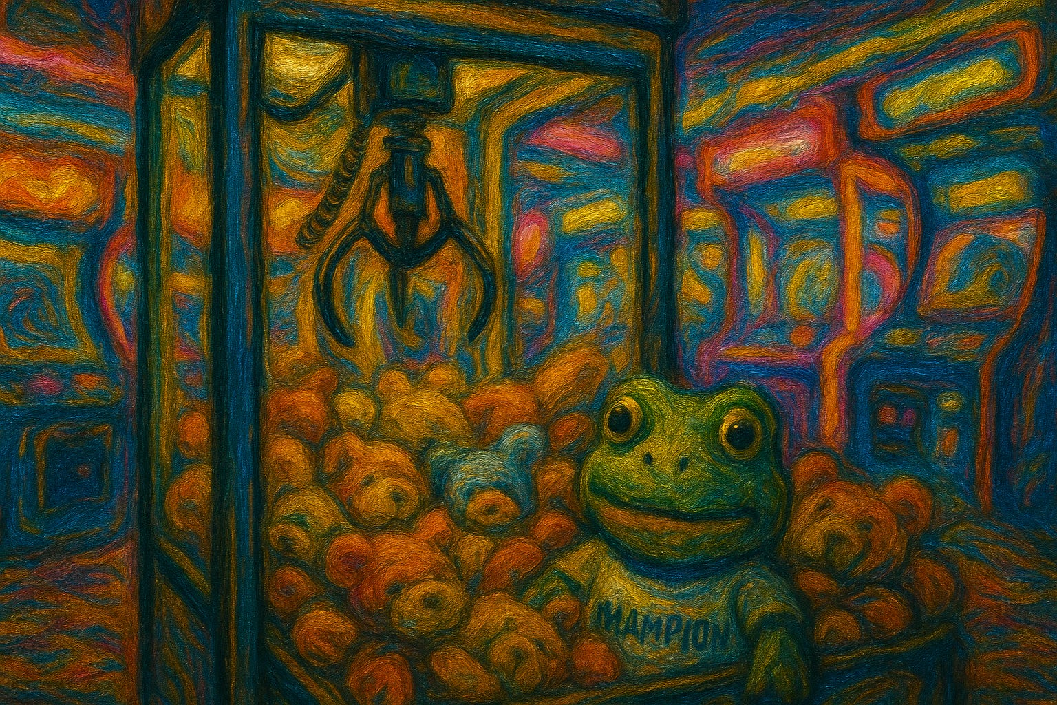 When they gave up, I stepped in. They watched on as the claw dropped, twitched, and caught a frog in a football shirt that said CHAMP10N.